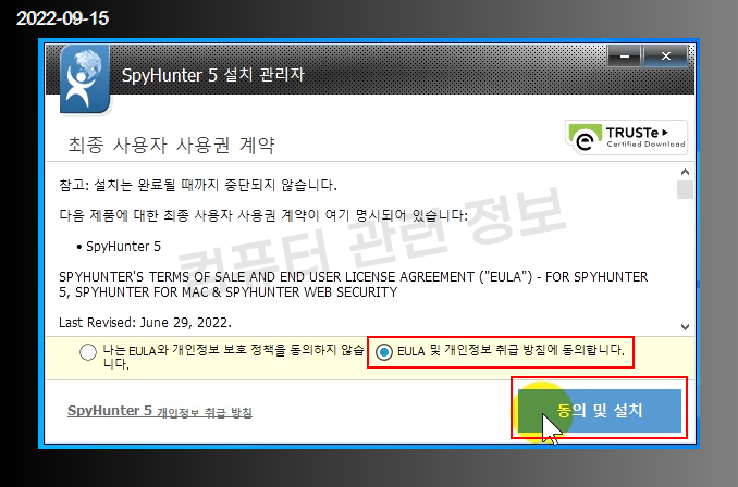 사용권 계약 동의에 체크하고 설치 클릭.