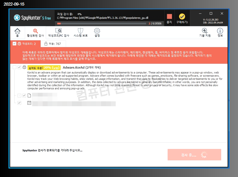 애드웨어 검출 스크린샷.