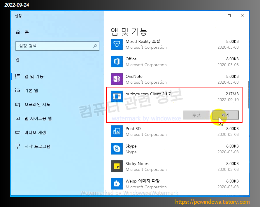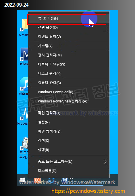 시작 메뉴 - 우클릭 - 앱 및 기능을 클릭하세요.