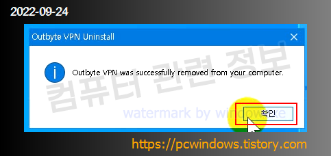 프로그램 제거가 완료되었습니다. 확인 클릭.