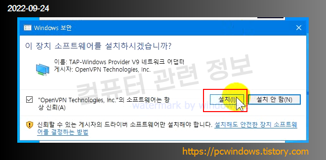 TAP-Windows Adapter V9 네트워크 어댑터 드라이버를 설치할건지 물어보는데 설치 클릭.