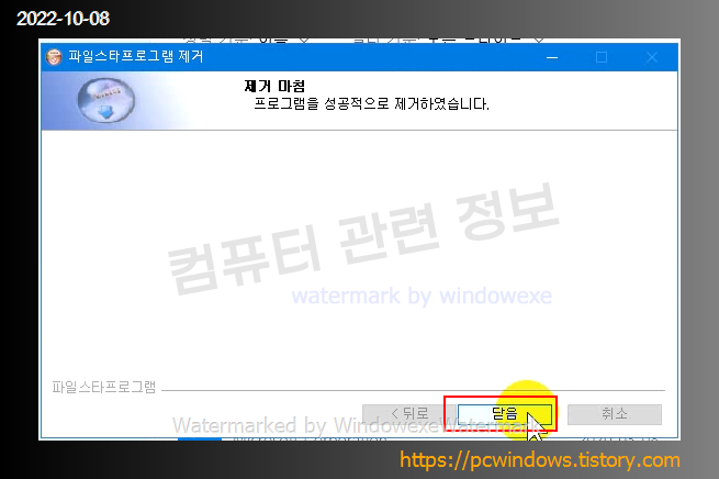프로그램 제거가 완료되었습니다. 닫음 클릭.