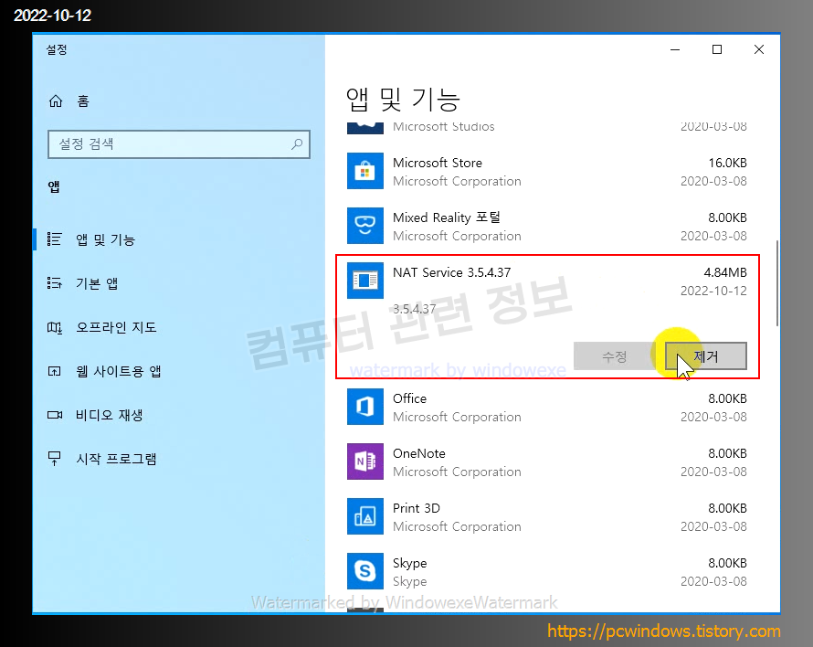 시작 - 우클릭 - 앱 및 기능 실행