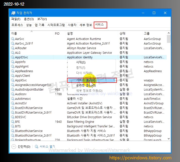 서비스 탭으로 이동해서 아무거나 선택하고 마우스 우클릭후 서비스 열기 클릭.