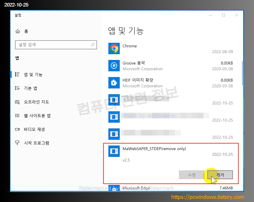 컴퓨터에 설치된 프로그램이 보이는데 MaWebSAFER_STDEP(remove only) 를 찾아서 제거 클릭.