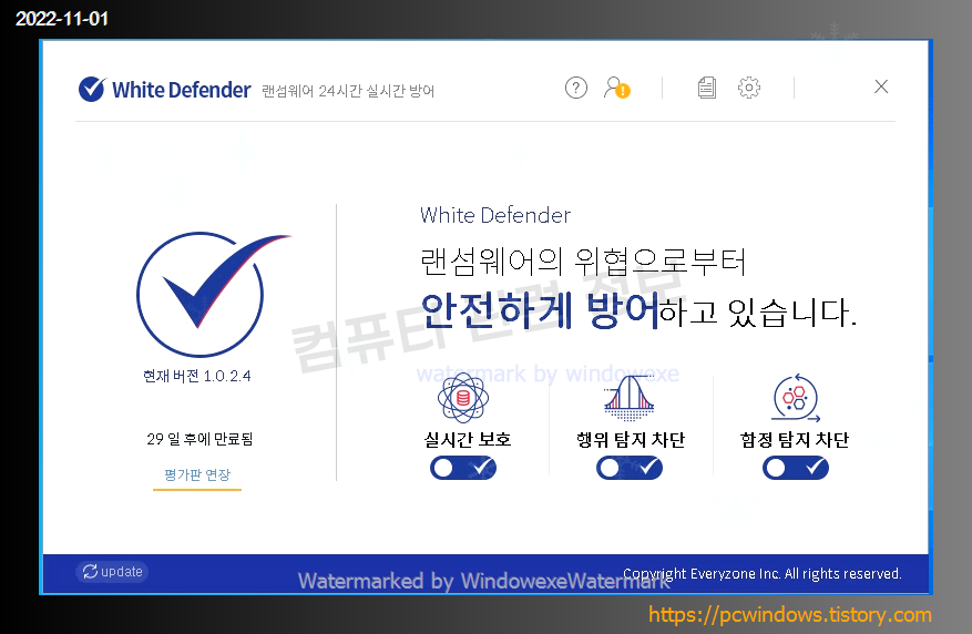 에브리존에서 제공하는 안티 랜섬웨어 프로그램, 화이트디펜더(WhiteDefender) 다운로드 및 설치, 프로그램 제거방법, 프로그램 설치후 생성되는 파일, 부팅시 자동으로 실행되는 프로세스 정보에 대해서 자세히 알아보겠습니다.