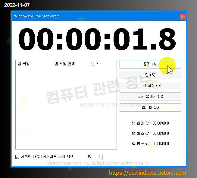 랩버튼을 클릭하면 랩타임이 추가되고, 하단에 최대, 최소, 평균값이 표시됩니다.