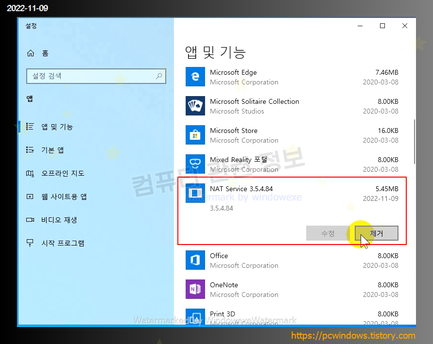 NAT Service 3.5.4.84 제거 클릭. 버전은 다를 수 있음.