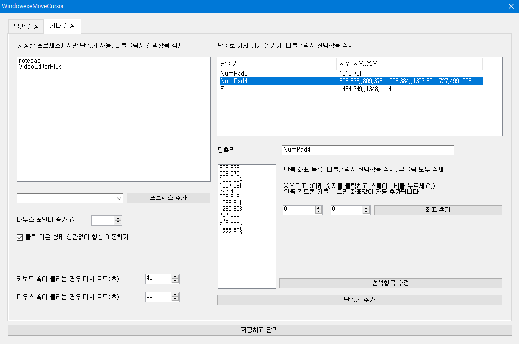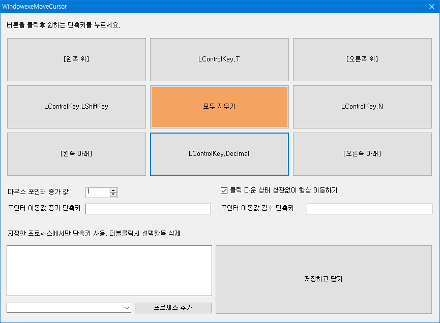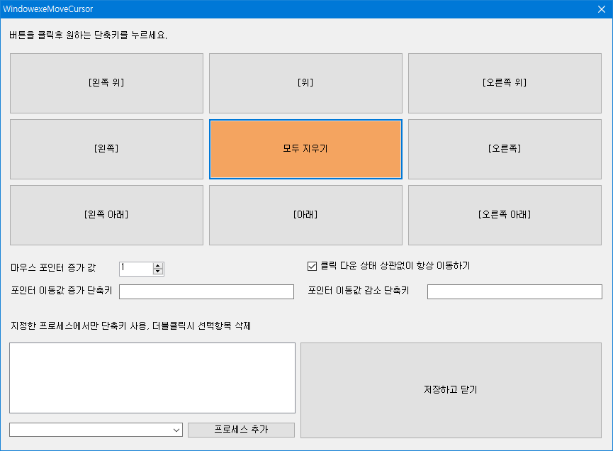 사용자가 원하는 단축키를 지정해서 마우스 커서를 일정한 간격, 일정한 방향으로 옮길 수 있는 자작 프로그램입니다.