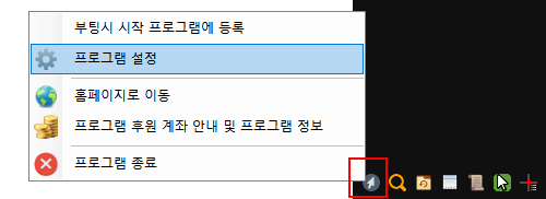 작업 표시줄 오른쪽 시스템 트레이에 동그란 커서 모양의 아이콘이 생깁니다. 마우스 우클릭해서 설정 클릭.