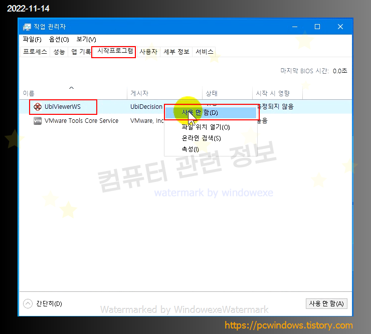 UbiViewerWS 를 선택하고 마우스 우클릭, 사용 안함을 클릭하면 됩니다.