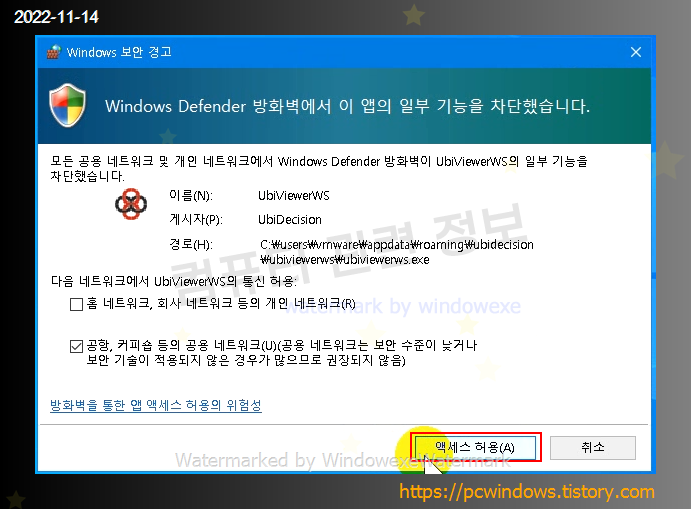 방화벽 액세스 허용 알림 메세지가 나오면 액세스 허용을 클릭하세요.