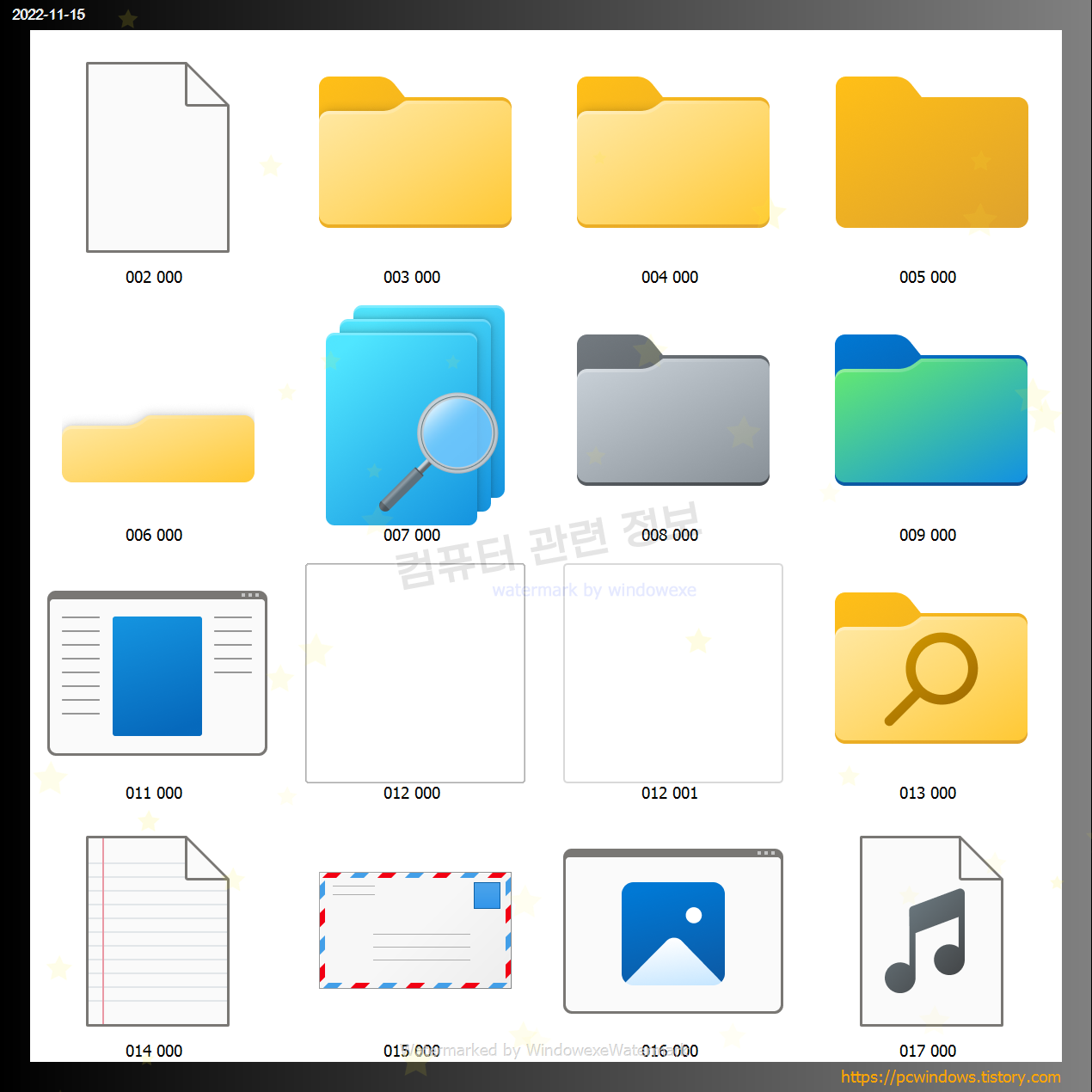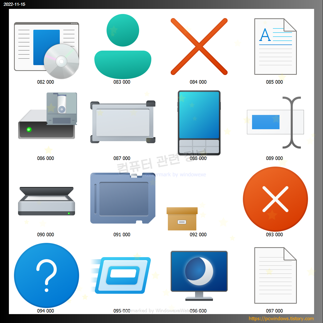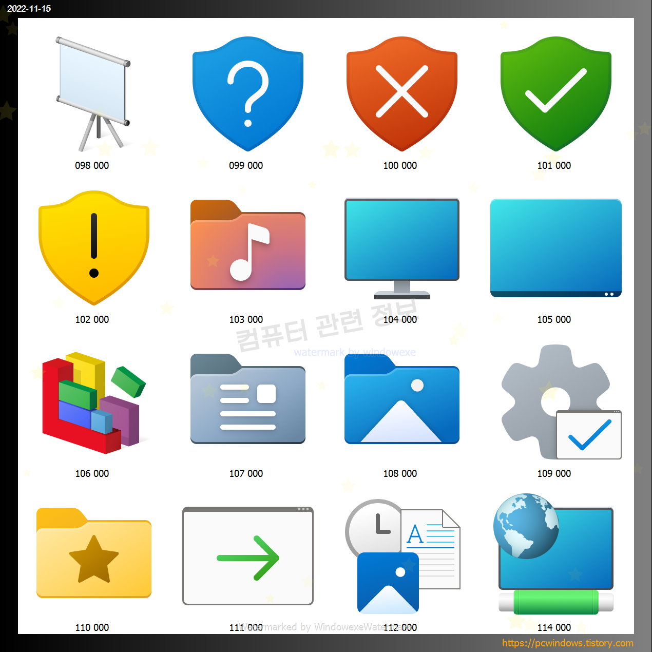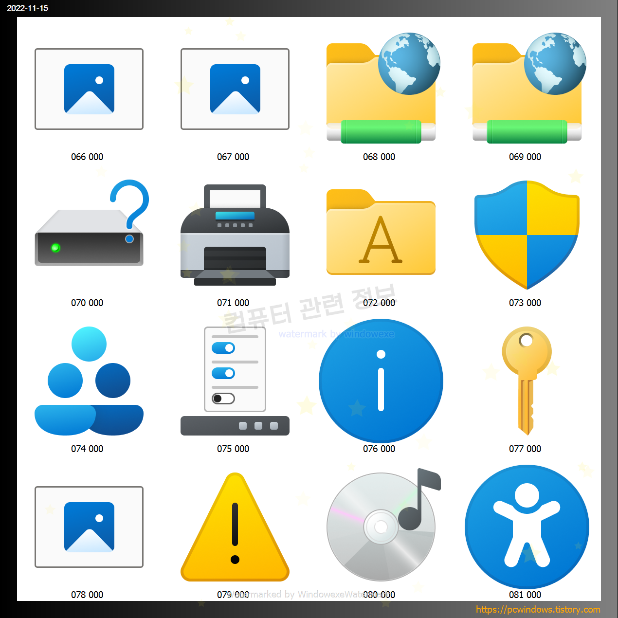 아이콘 라이브러리 파일은 여러개가 있는데요. 이중에서 imageres.dll 파일안에 있는 모든 아이콘을 각 크기별로 추출해서 바로 사용할 수 있도록 모든 파일을 압축하였습니다.