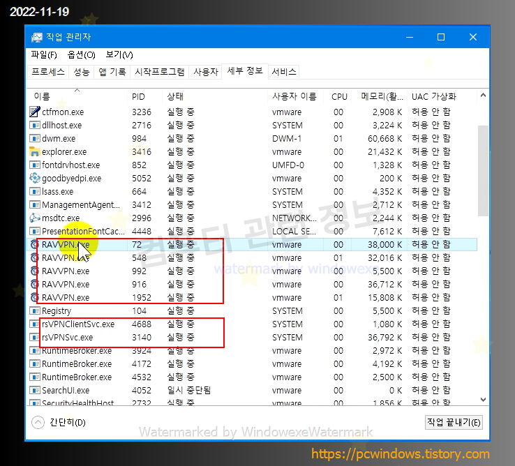 RAVVPN.exe , rsVPNClientSvc.exe , rsVPNSvc.exe 세개의 프로세스가 실행되고 있네요.