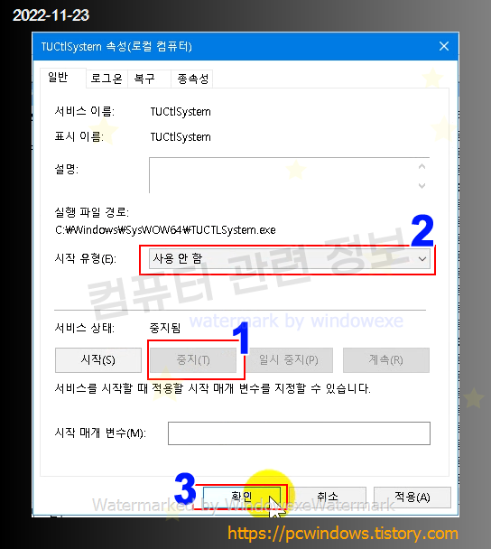 시스템에 설치된 서비스 목록이 많이 보이는데 TUCtlSystem 를 찾아서 더블클릭.