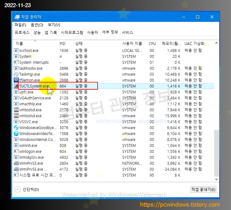 TUCTLSystem.exe 프로세스가 보이는데 이 프로그램은 부팅시마다 자동으로 실행됩니다.