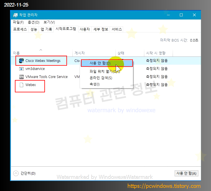 Cisco Webex Meetings 를 마우스 우클릭하고 사용안함을 클릭하면 됩니다.