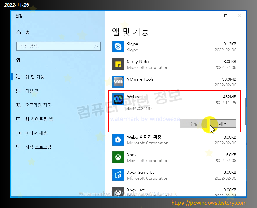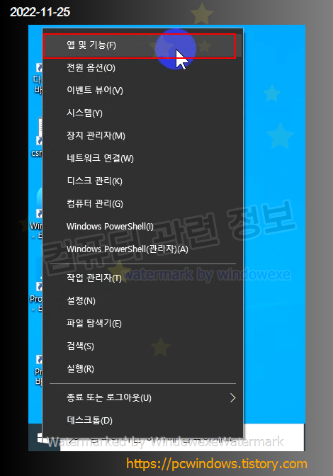 시작 - 우클릭 - 앱 및 기능 실행.