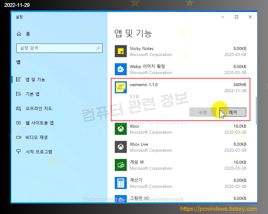 wememo 1.1.0 를 찾아서 제거 클릭.