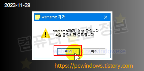 프로그램이 실행중이면 종료 확인 메세지가 나옵니다. 확인 클릭.