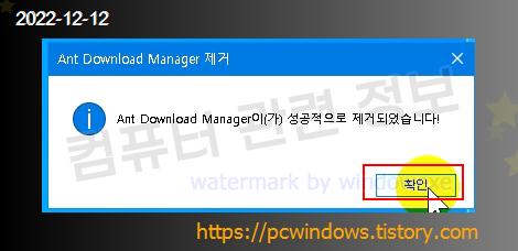 프로그램이 정상적으로 제거되었습니다. 확인 클릭.