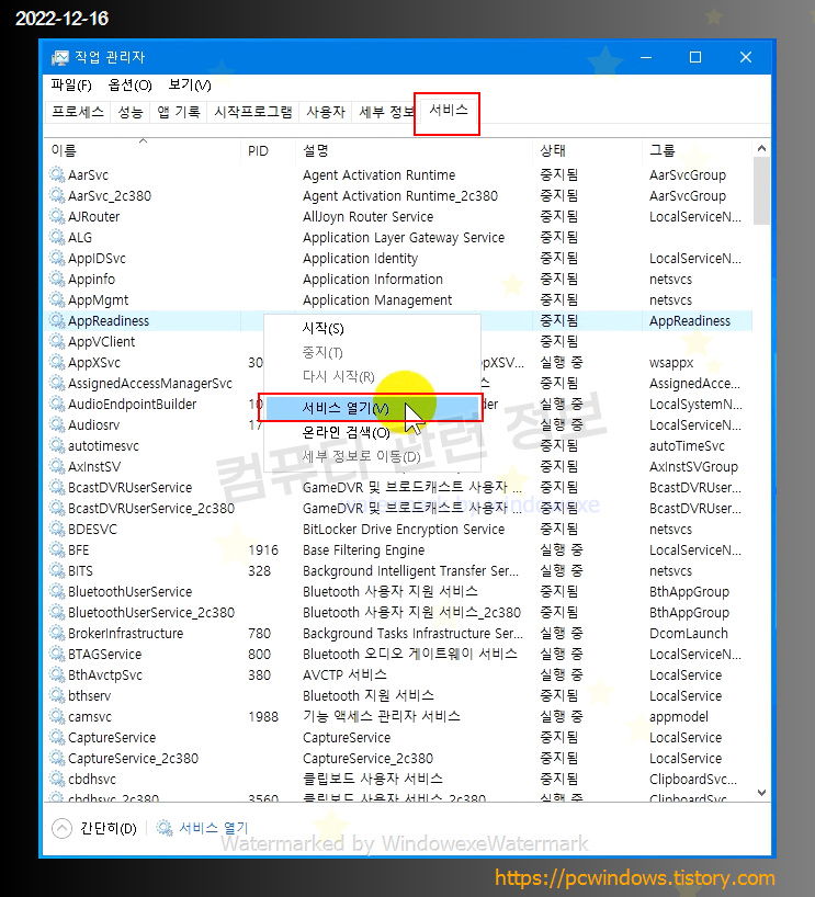 작업관리자 - 서비스 탭으로 이동해서 서비스 열기 클릭.
