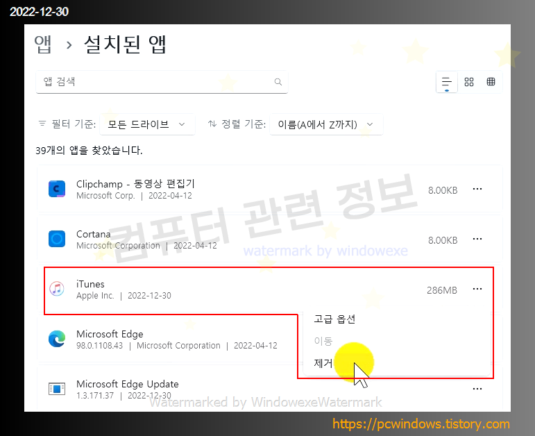 컴퓨터에 설치된 앱이 표시되는데요. iTunes 옆에 점 세개를 클릭하고 제거를 클릭하세요.
