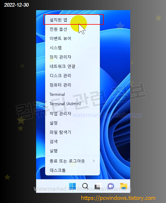 시작 - 우클릭 - 설치된 앱 클릭. (일부 컴퓨터는 앱 및 기능으로 표시됩니다.)
