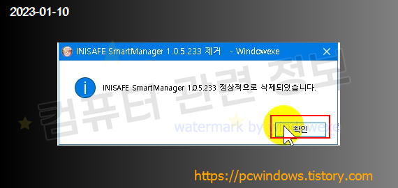 프로그램이 정상적으로 제거되었습니다. 확인을 클릭하세요.