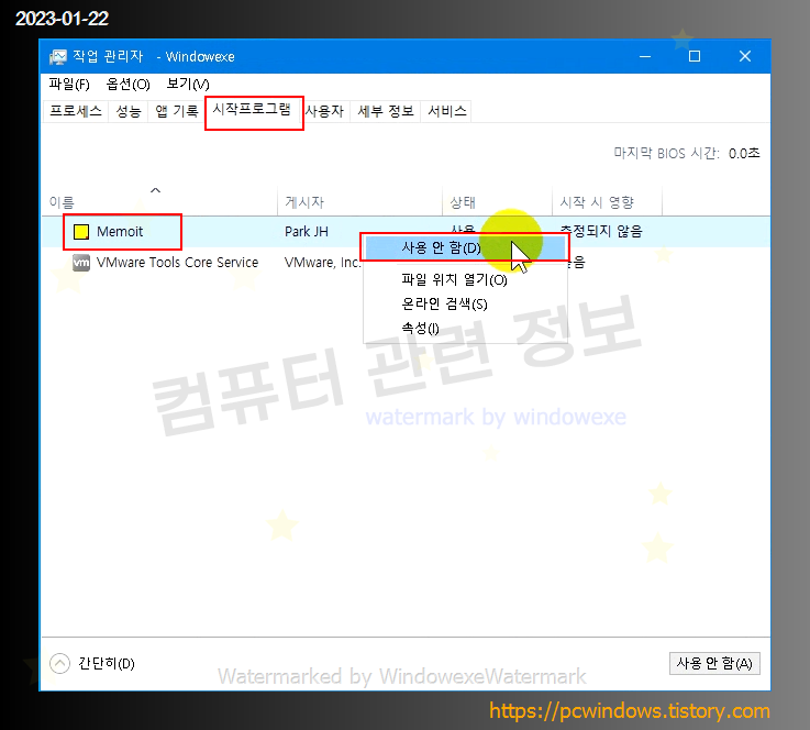부팅시 자동으로 실행되는 프로그램을 중지시키려면 작업관리자 - 시작 프로그램 탭에서 Memoit 을 우클릭하고 사용안함으로 변경하세요.