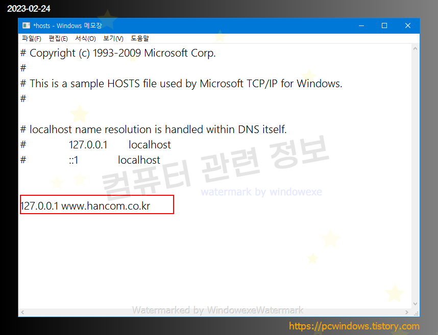 메모장 제일 하단에 127.0.0.1 www.hancom.co.kr 를 복사하고 붙여넣기 하세요.