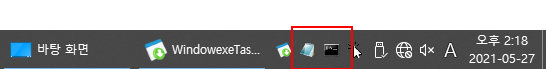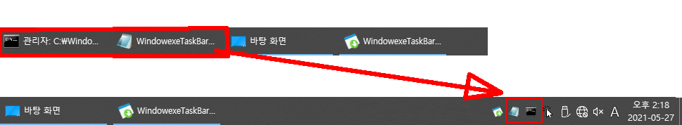 아래 스크린샷은 명령 프롬프트 프로그램하고 메모장이 시스템 트레이로 옮겨진 화면입니다.