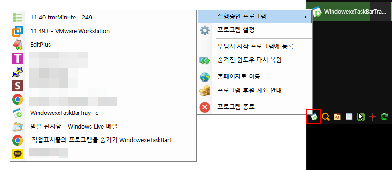 작업표시줄에서 실행되고 있는 프로그램의 바(?)를 시스템 트레이로 보내는 WindowexeTaskBarTray 프로그램입니다.