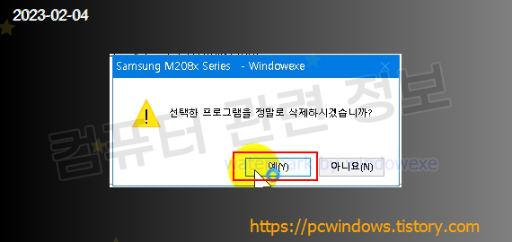 프로그램을 삭제할건지 물어보는데 예 클릭.