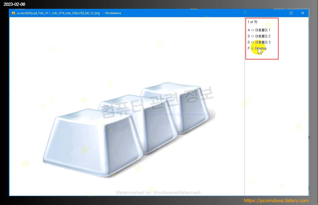 왼쪽에는 이미지가 표시되고, 오른쪽에는 이미지 인덱스 번호와 총 이미지 갯수, 단축키별 폴더가 표시됩니다.