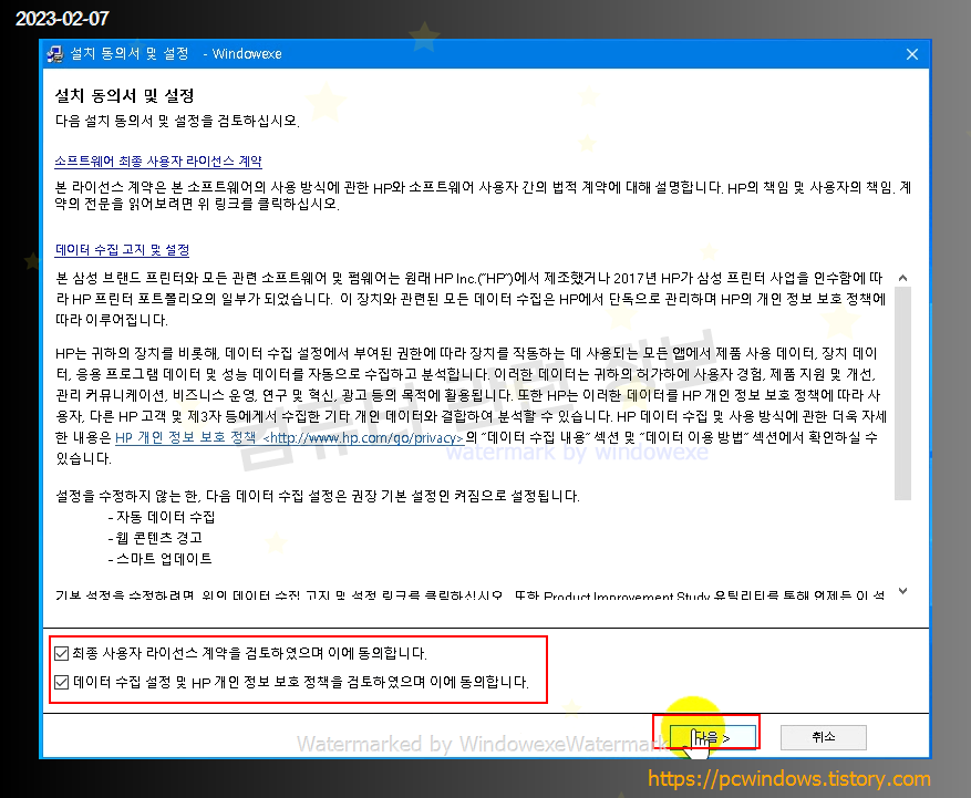 라이선스 동의 및 데이터 수집에 체크하고 다음 클릭.