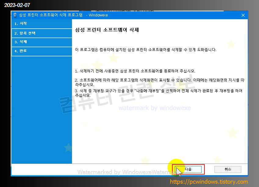 프린터 삭제 마법사가 실행됩니다. 다음 클릭.