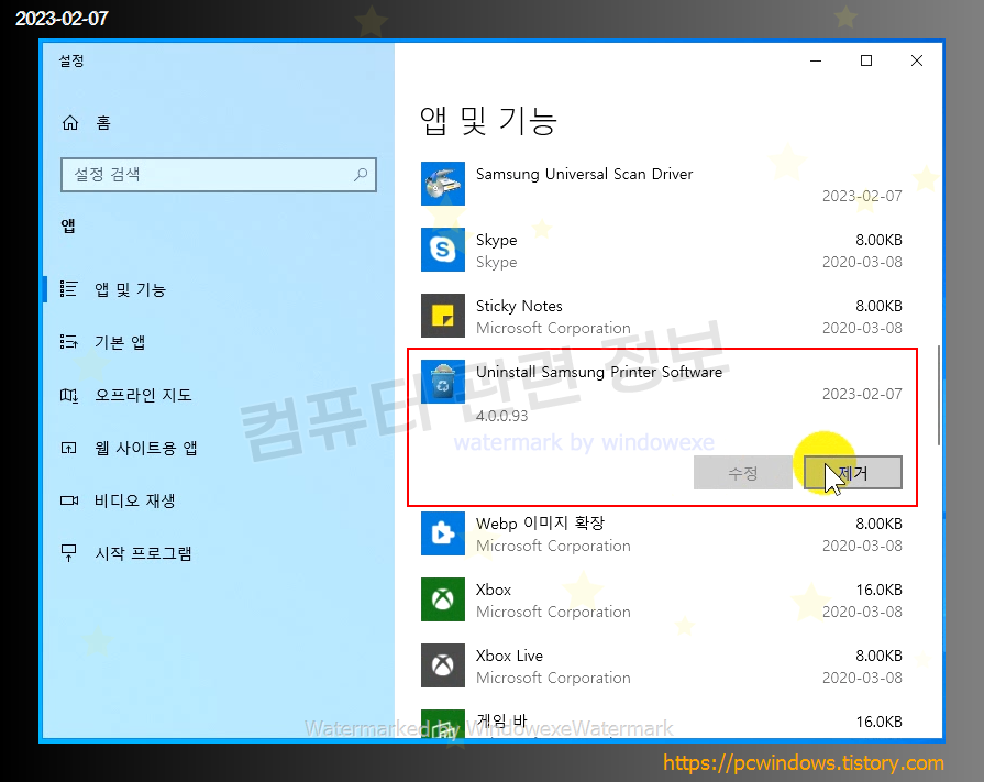 Uninstall Samsung Printer Software 제거 클릭.