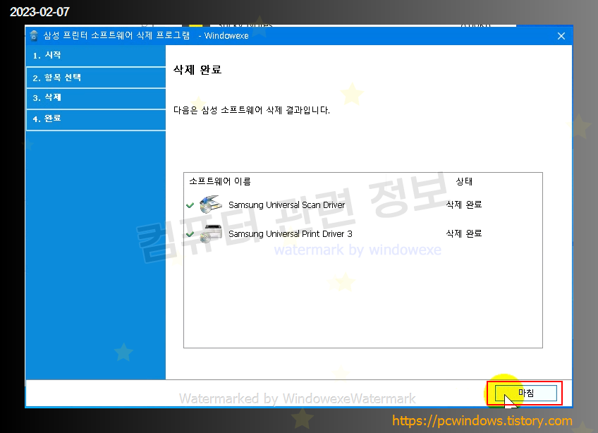프로그램이 정상적으로 제거되었습니다. 마침 클릭.