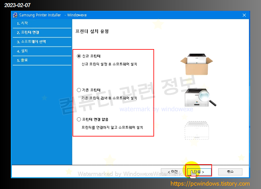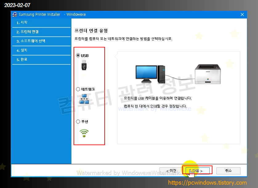 프린터 연결 유형을 선택하고 다음을 클릭하세요.