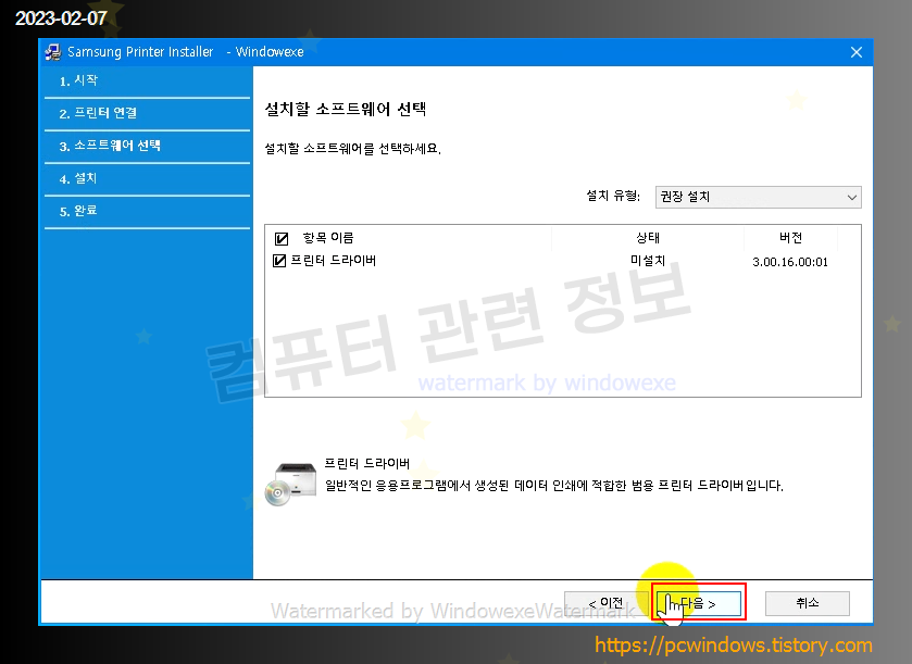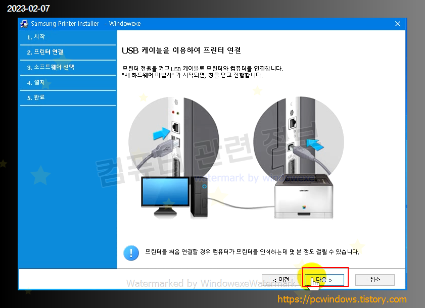 프린터를 컴퓨터랑 연결하고 다음을 클릭하세요.