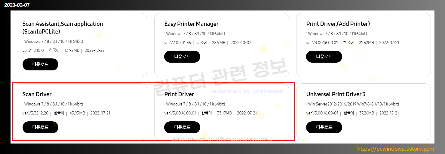 아래쪽에 윈도우용 스캐너 드라이버, 프린터 드라이버를 다운로드 받으면 됩니다. 드라이버 종류도 많기 때문에 원하는 파일을 받으면 됩니다.
