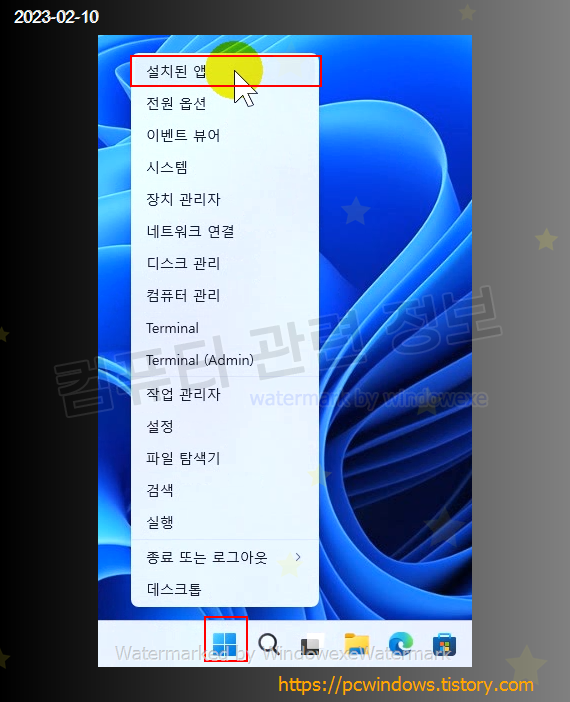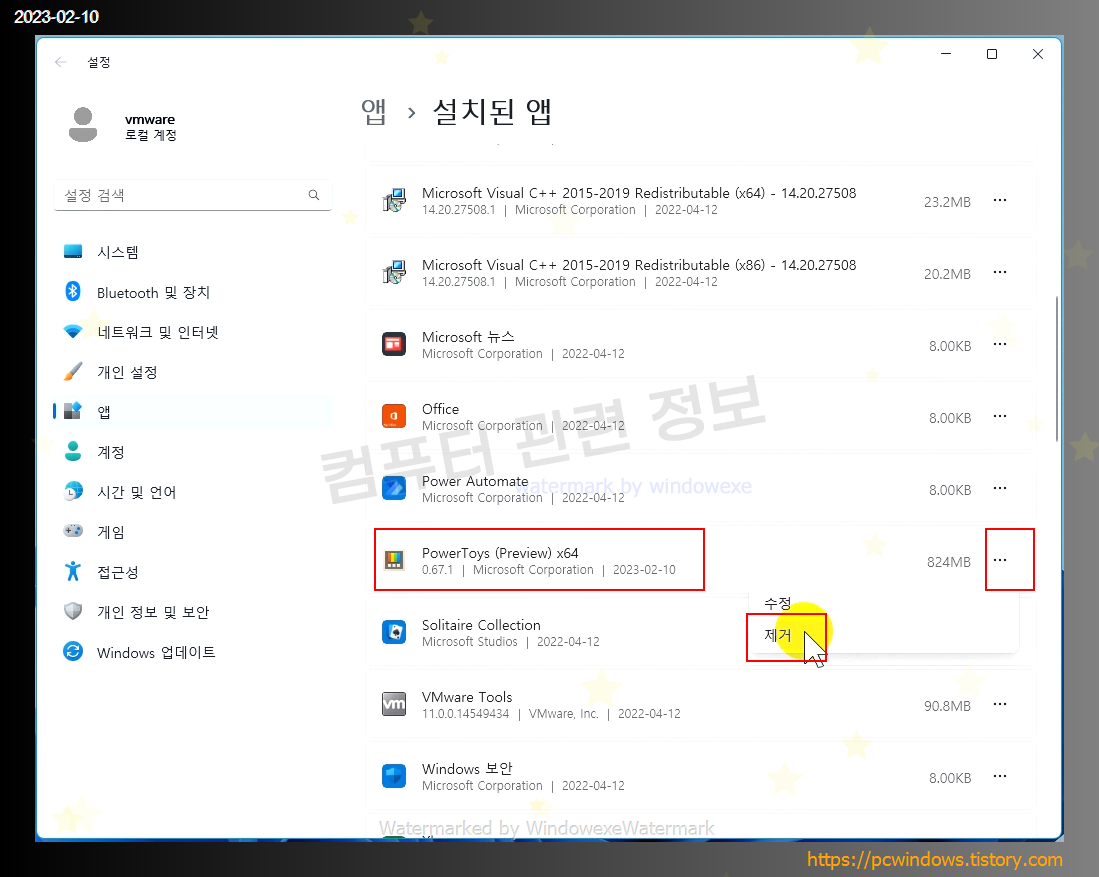 시작 - 우클릭 - 설치된 앱 실행. (앱 및 기능으로 표시되는 버전도 있음)