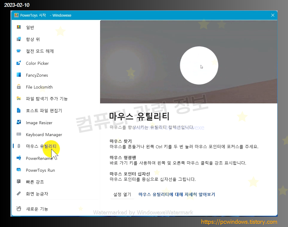 마우스 유틸리티. 마우스 찾기, 형광펜, 십자선 표시 도구입니다.