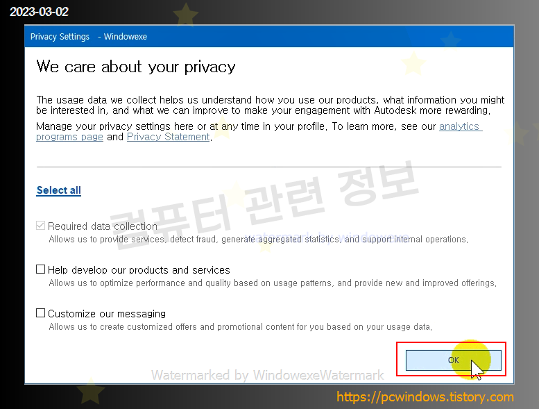 개인정보 설정에 관한 창이 뜨는데요. OK 클릭.