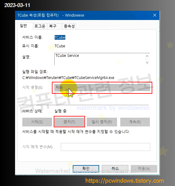 서비스 속성화면입니다. 중지 및 시작 유형이 비활성화가 되어 있습니다.