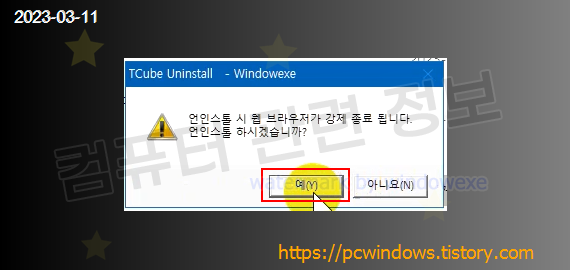 웹브라우저를 모두 종료할건지 물어보는데 예를 클릭하세요.
