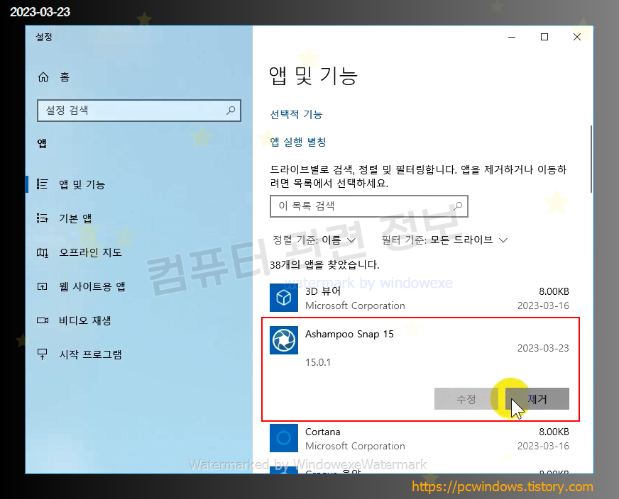 Ashampoo Snap 15 를 찾아서 제거클릭