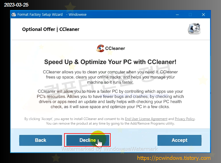 CCleaner 스폰서 프로그램을 설치할건지 물어보는데 Decline 클릭