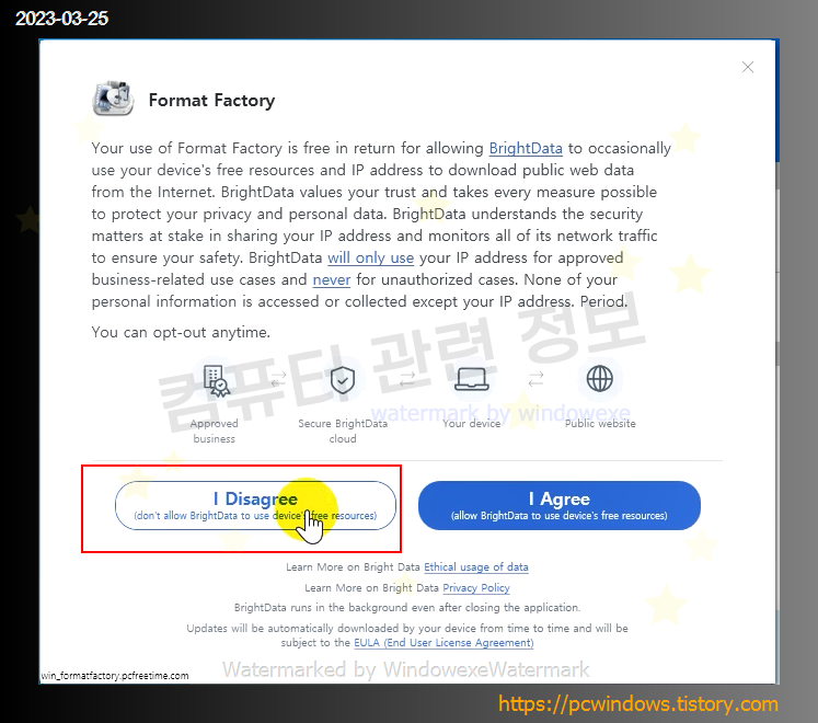 비 개인정보 수집에 관한 내용이 나오는데 I Disagree 클릭